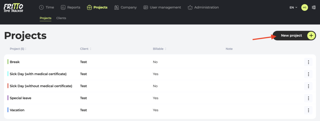 Now define which booking types your company needs — vacation, sick leave with and without a note, breaks, special leave, and more. Everything can be flexibly adjusted, directly within the project settings.
