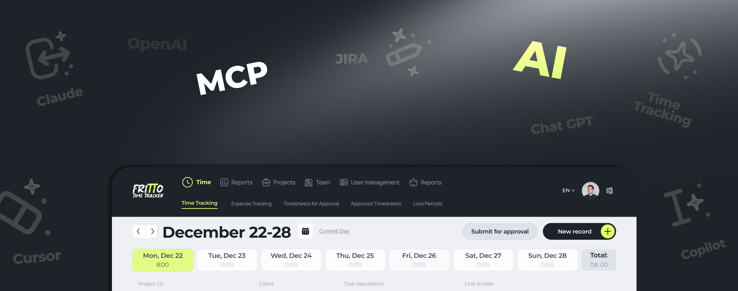Fritto offers a wide range of features: you can track time for activities and projects, log time on behalf of other users, submit entries for approval, and review approved entries. You can also lock time periods to prevent retroactive changes — ensuring you always have full control over your time!
