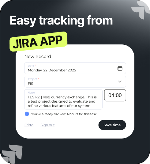 Time tracking directly in Jira — Log working hours without leaving Jira, right from the task.
